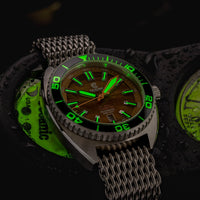 This special edition watch features an all-Sapphire unidirectional rotating bezel that bears hour-markers filled with seven layers of Swiss C3 Lume. Powerful C3 Lume on the key elements guarantees perfect readability when deep diving. Each timepiece includes both, a shark mesh bracelet, and a rubber strap.