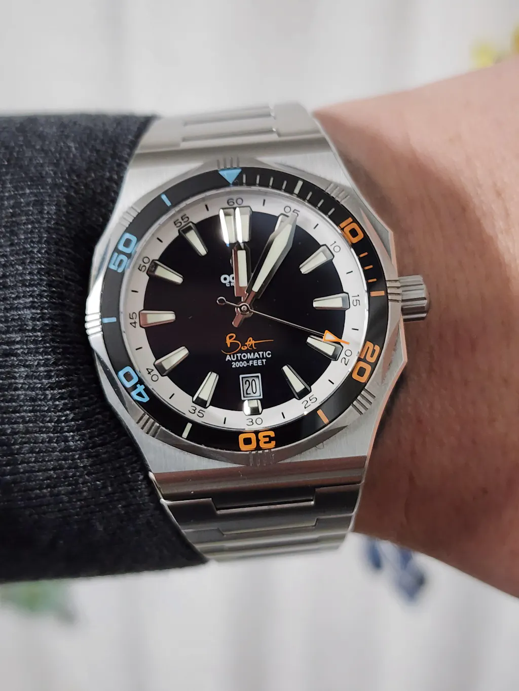 The movement inside the Bolt is a regulated Sellita SW200-1 movement. It has a beat rate of 28,800 vibrations per hour and has been enhanced for added accuracy.